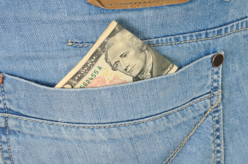 Десять долларов торчат из кармана джинсов
