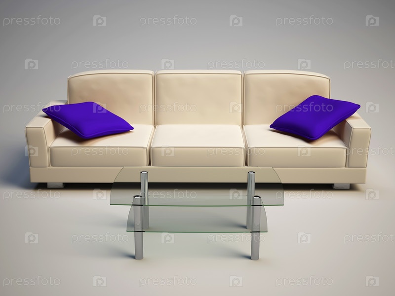 Диван с синими подушками и стеклянный стол на сером фоне