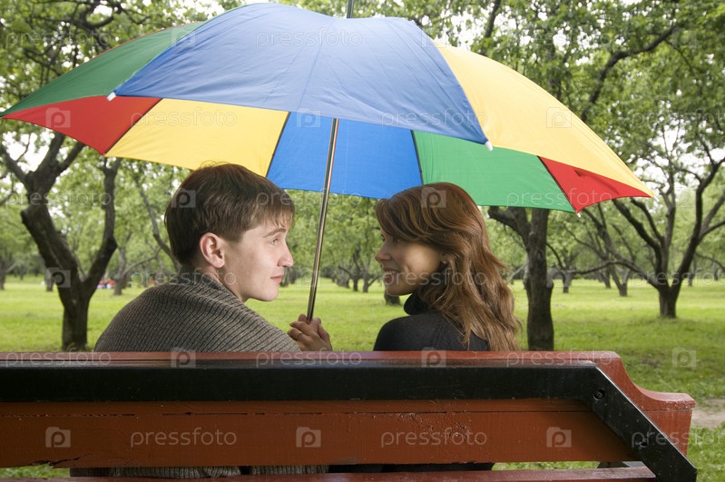 Счастливая влюбленная пара под разноцветным зонтом сидит на скамейке