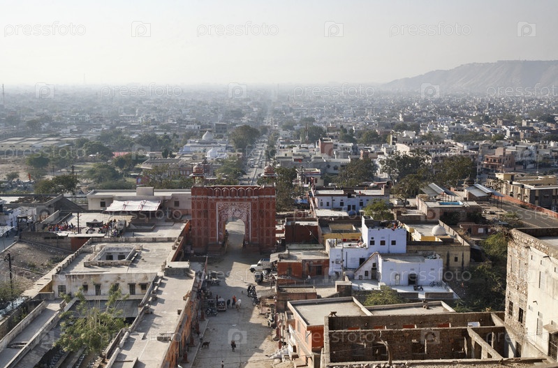 Индия, Раджастхан, Джайпур, панорамный вид города и одни из старых входных ворот