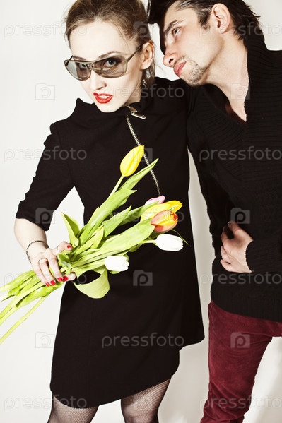 Влюбленная пара с букетом тюльпанов на белом фоне