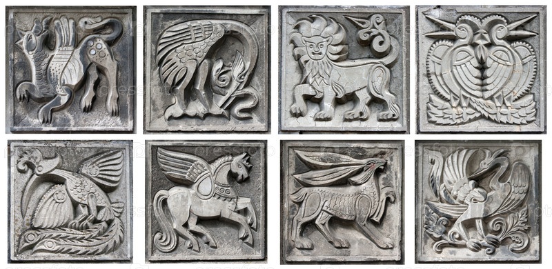 Старые барельефы сказочных животных на стене