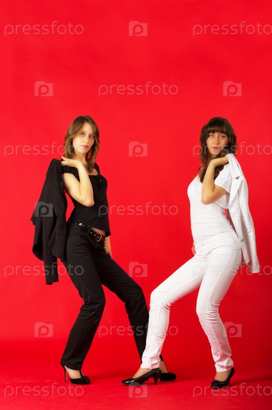 Сексуальные сестры близнецы в черном и белом костюмах позируют в студии на красном фоне