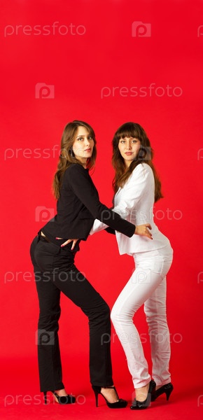 Молодые сестры близнецы в черном и белом костюмах позируют в студии на красном фоне