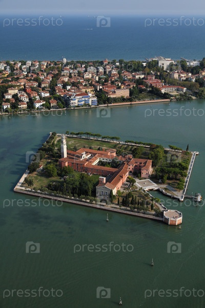 Италия, Венеция, остров Мурано, остров Сан-Ладзаро дельи Армени и Венецианская лагуна. Аэрофотоснимок