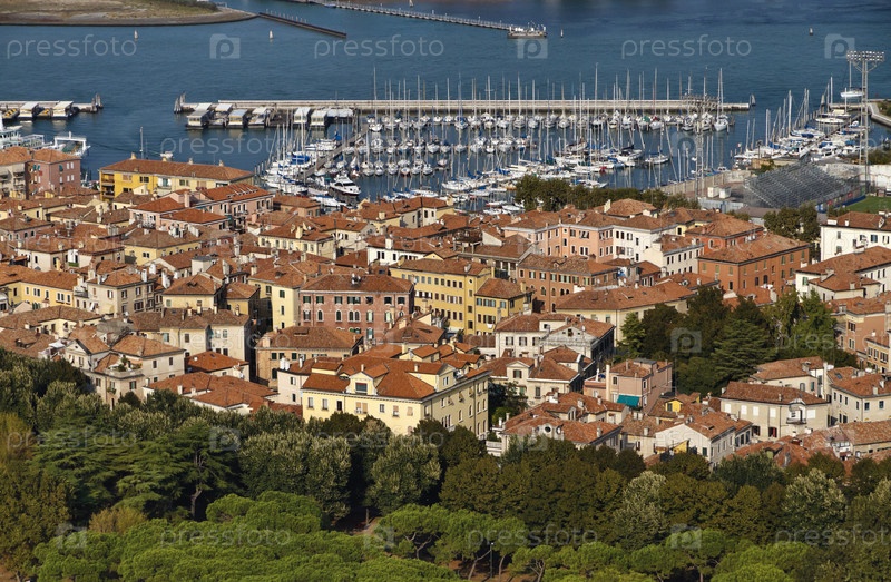 Италия, Венеция. Аэрофотоснимок города и пристани в Венецианской лагуне