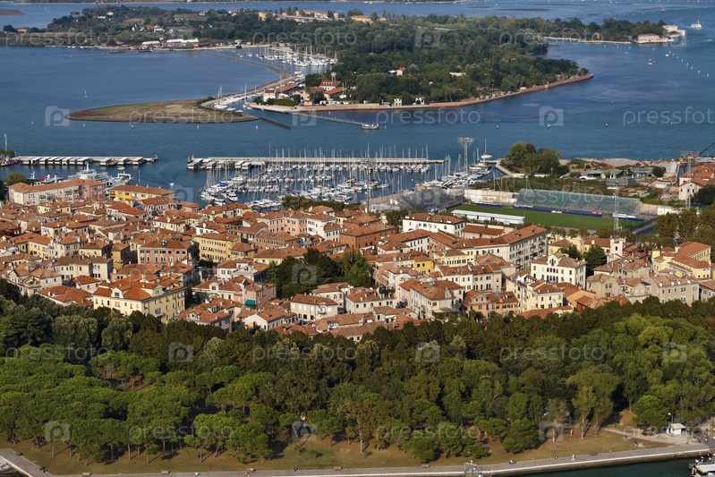 Италия, Венеция. Аэрофотоснимок города и пристани в Венецианской лагуне