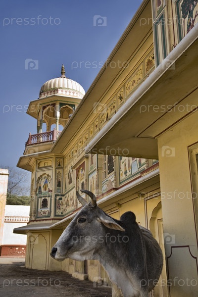 Священная корова перед дворцом, Индия, Раджастан, Джайпур