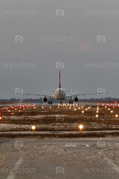 Италия, Международный аэропорт Венеции, огни взлетно-посадочной полосы и самолет