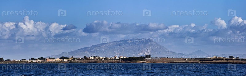 Италия, Сицилия, Моция(Трапани), панорамный вид на побережье и город Эриче на холме
