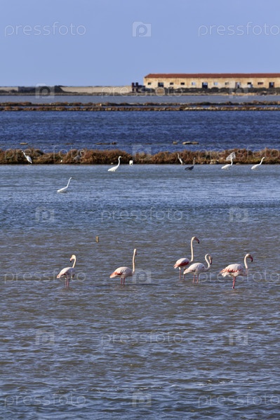 Италия, Сицилия, Марсала (Трапани), солончаки, красные фламинго и цапли
