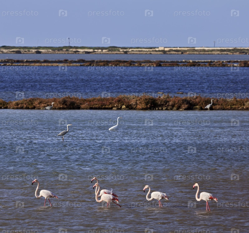 Италия, Сицилия, Марсала (Трапани), солончаки, красные фламинго и цапли