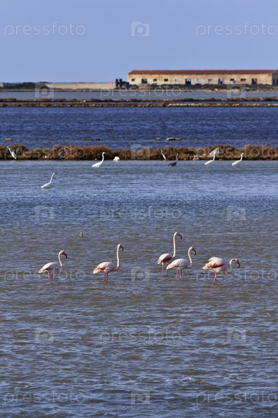 Италия, Сицилия, Марсала (Трапани), солончаки, красные фламинго и цапли
