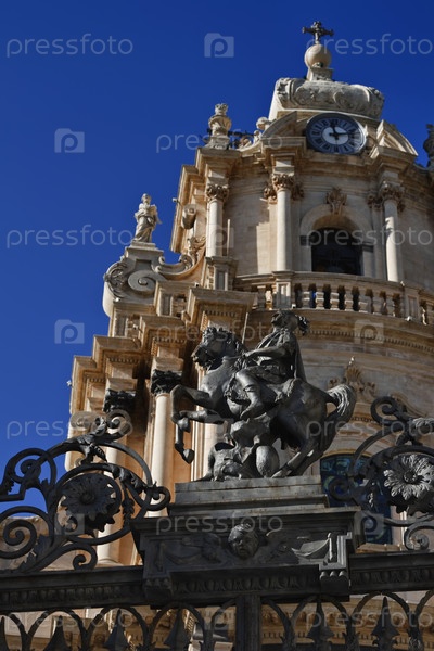 Италия, Сицилия, Рагузы Ибла. Собор Святого Георгия, железная статуя Святого Георгия на входных воротах