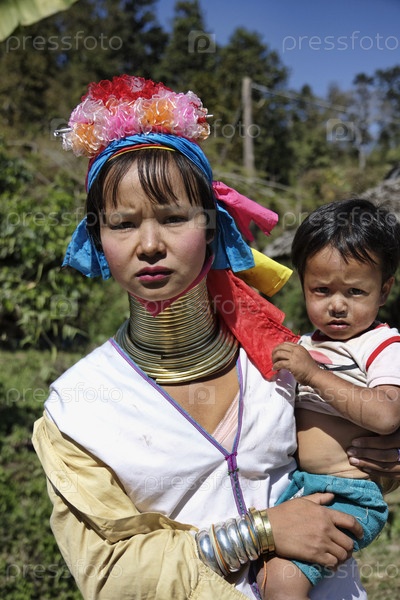 Женщина в традиционном костюме деревнии Каян и ее ребенок, Таиланд, Чианг Май