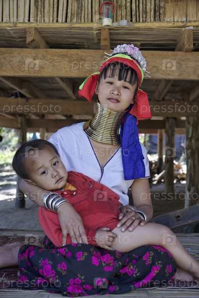 Женщина в традиционном костюме деревнии Каян и ее ребенок, Таиланд, Чианг Май