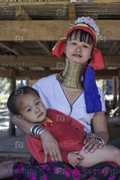 Женщина в традиционном костюме деревнии Каян и ее ребенок, Таиланд, Чианг Май