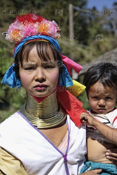 Древнее племя. Женщина в традиционном костюме с латунными кольцами на шее. Таиланд, Чанг Маи