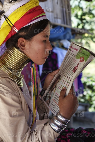 Древнее племя. Женщина в традиционном костюме с латунными кольцами на шее. Таиланд, Чанг Маи