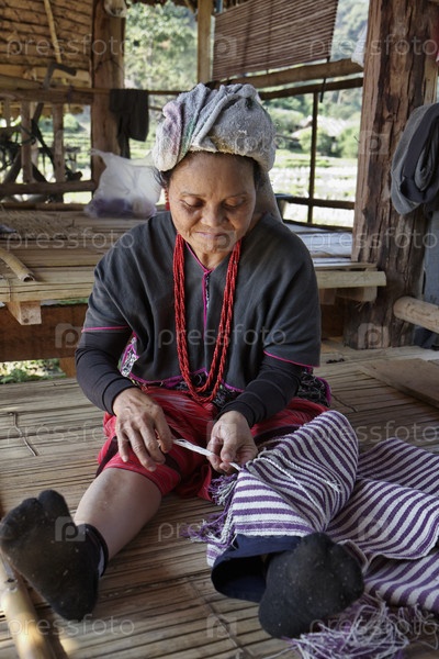 Таиланд, Чианг Май, деревня племени Карен, женщина в традиционном костюме делает ковер