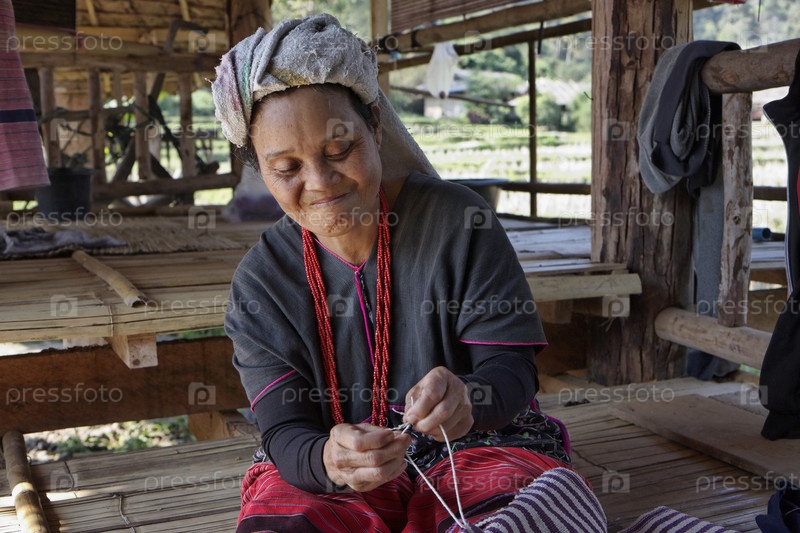 Таиланд, Чианг Май, деревня племени Карен, женщина в традиционном костюме делает ковер