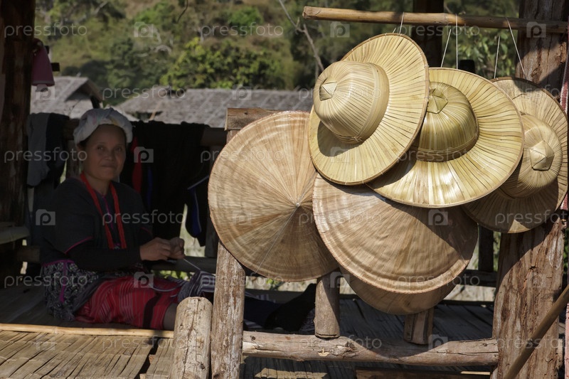 Старая женщина в традиционном костюме своей деревни продает восточные шляпы, Таиланд
