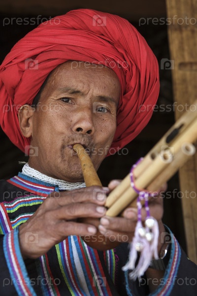 Таиланд, Чианг Май, деревня племени Карен, мужчина в традиционном костюме играет на флейте