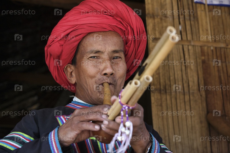 Таиланд, Чианг Май, деревня племени Карен, мужчина в традиционном костюме играет на флейте