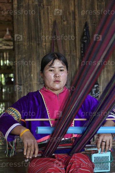 Молодая женщина в традиционном костюме своей деревни, ткет ковер, Таиланд