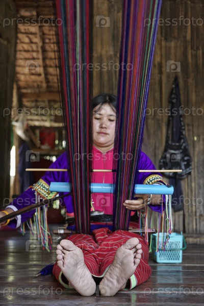 Молодая женщина в традиционном костюме своей деревни, ткет ковер, Таиланд