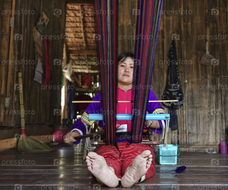 Молодая женщина в традиционном костюме своей деревни, ткет ковер, Таиланд