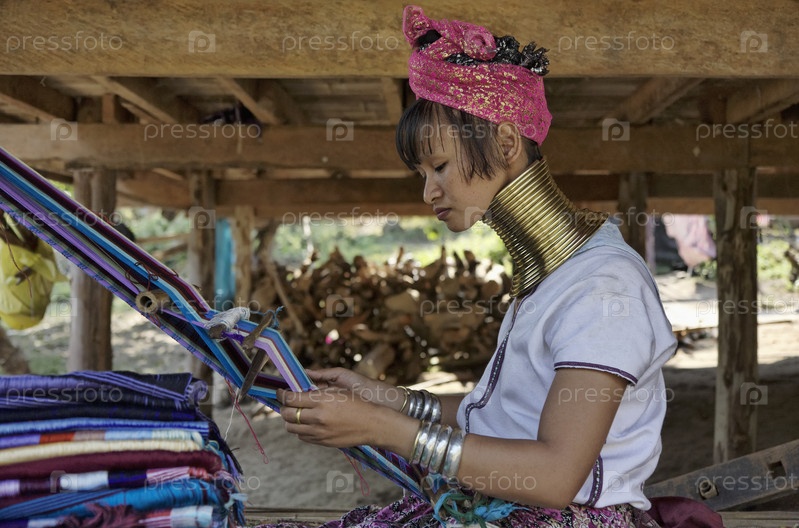 Молодая тайская девушка в традиционном костюме своей деревни, ткет ковер