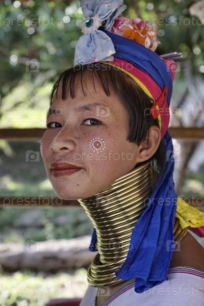 Таиланд, Чанг Маи, деревня племени Карен, девушка в традиционном костюме с латунными кольцами на шее в качестве символа красоты