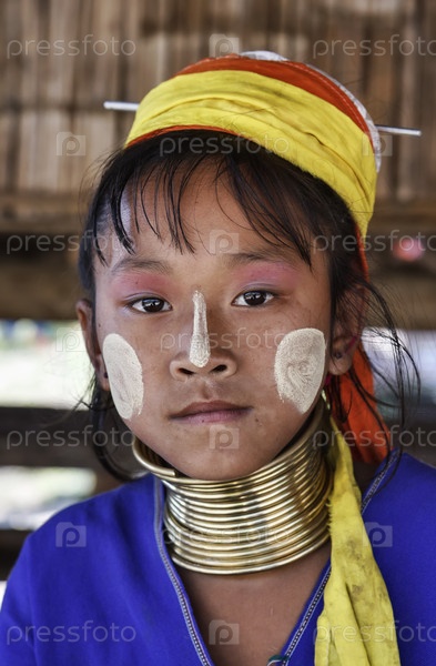 Таиланд, Чанг Маи, деревня племени Карен, девушка в традиционном костюме с латунными кольцами на шее в качестве символа красоты