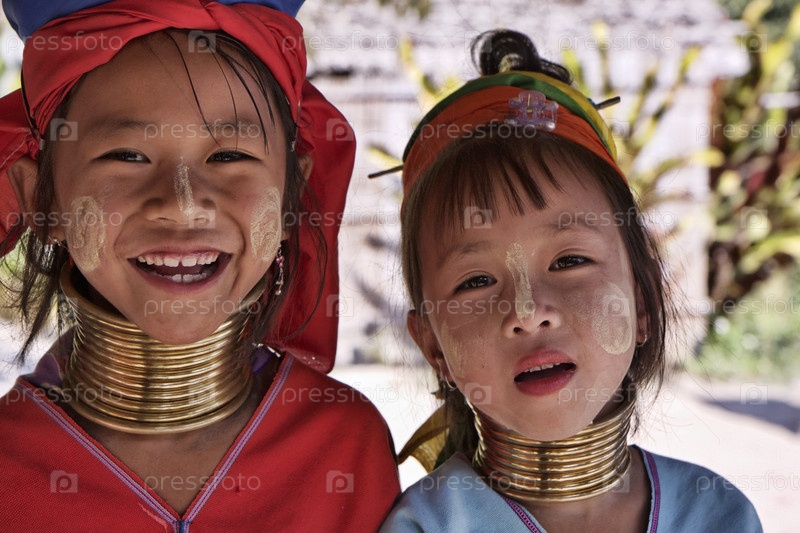 Древнее племя. Девочки в традиционных костюмах с латунными кольцами на шее. Таиланд, Чанг Маи