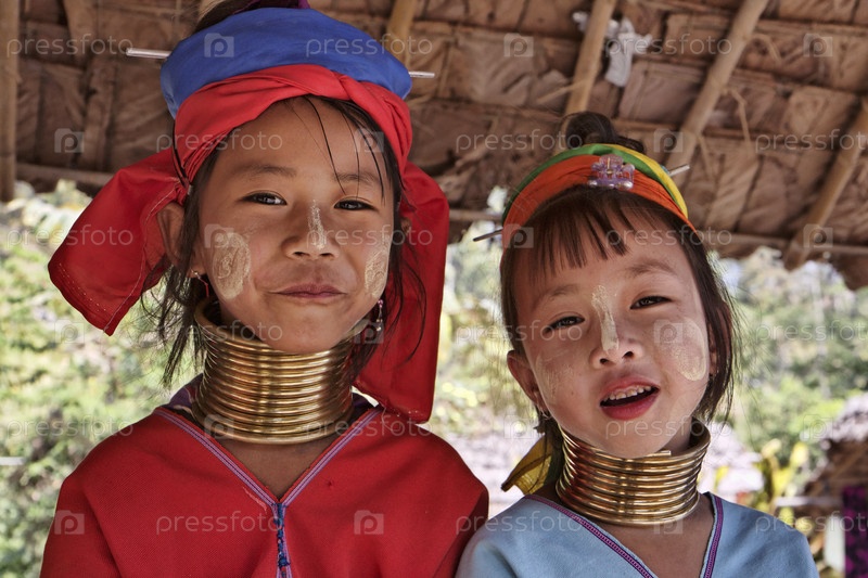 Древнее племя. Девочки в традиционных костюмах с латунными кольцами на шее. Таиланд, Чанг Маи