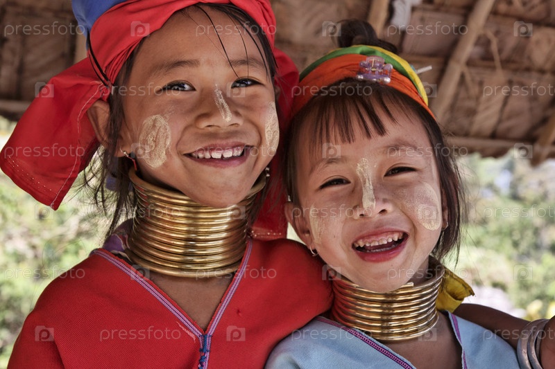 Древнее племя. Девочки в традиционных костюмах с латунными кольцами на шее. Таиланд, Чанг Маи