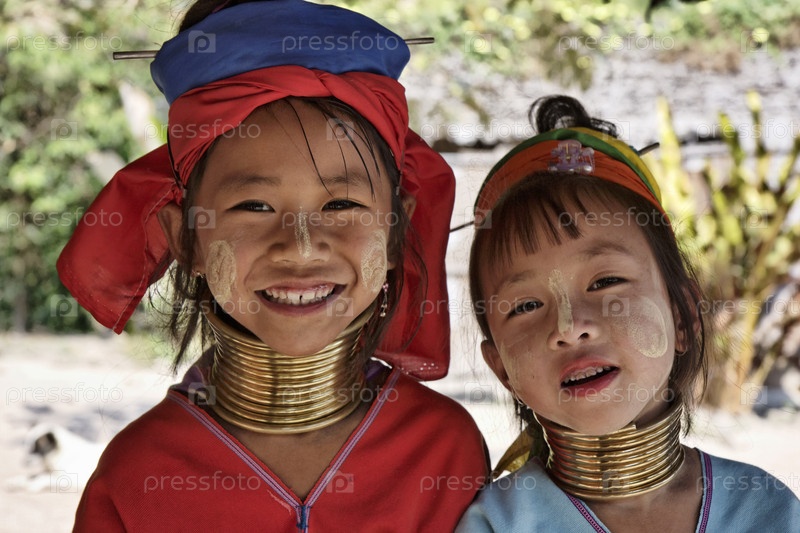 Древнее племя. Девочки в традиционных костюмах с латунными кольцами на шее. Таиланд, Чанг Маи