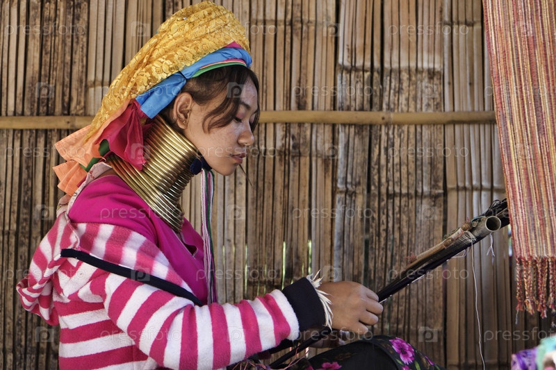 Молодая тайская девушка в традиционном костюме своей деревни, ткет ковер