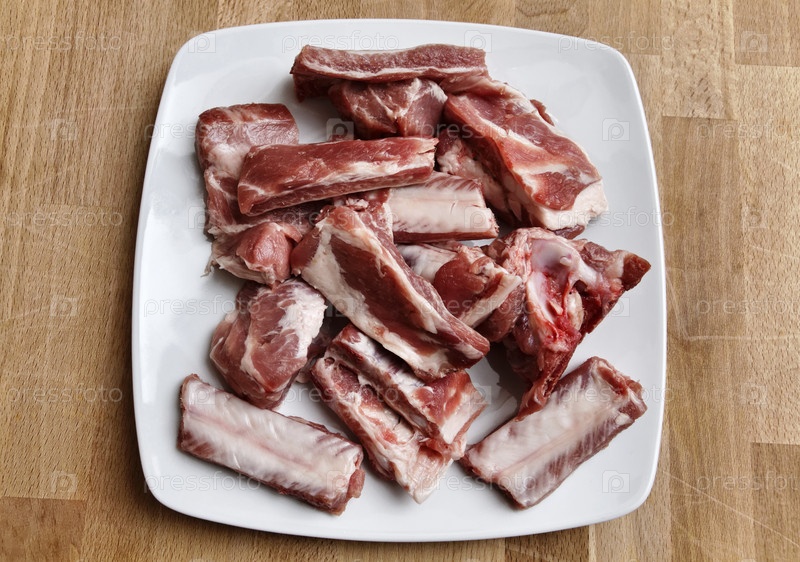 Сырые свиные ребрышки на белой тарелке