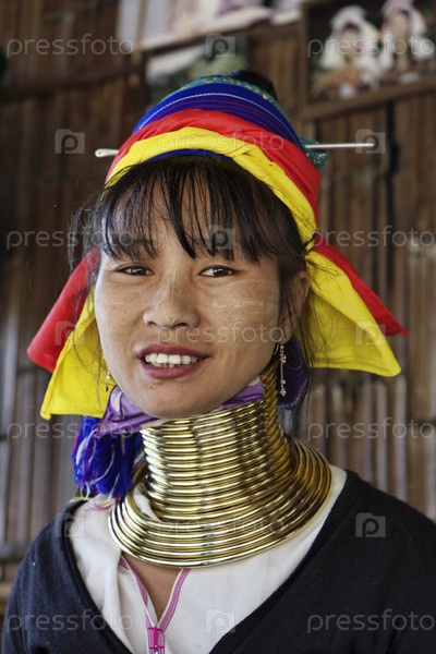 Таиланд, Чианг Май, падаунг - народ группы каренов, женщина-падаунг в традиционном костюме. Женщины надевают латунные кольца на шею в 5-6 лет и увеличивают ежегодно их количество для увеличения длины шеи