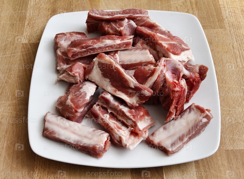 Сырые свиные ребрышки на белой тарелке
