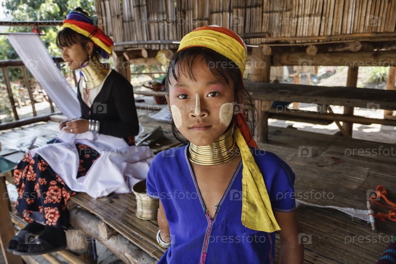 Таиланд, Чианг Май, падаунг - народ группы каренов, девушка и ее мать в традиционном костюме. Женщины надевают латунные кольца на шею в 5-6 лет и увеличивают ежегодно их количество для увеличения длины шеи