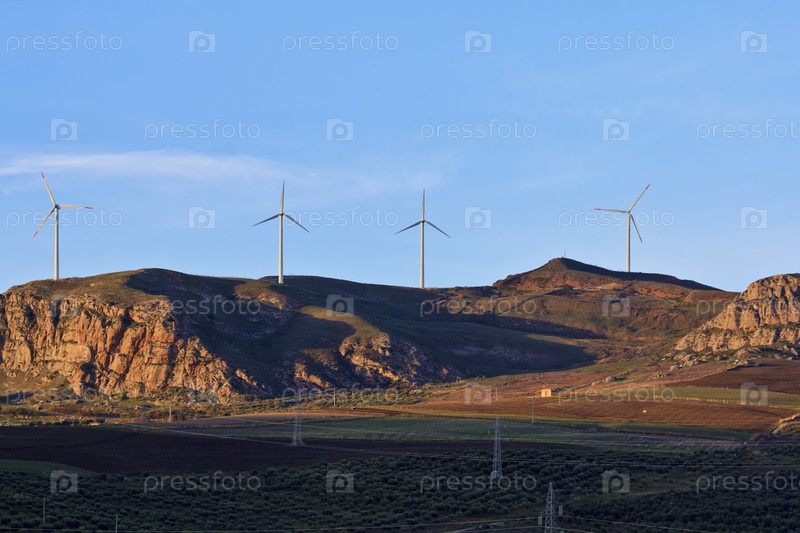 Италия, Сицилия, горы Сикааны, ветряные турбины на закате и линия электропередачи