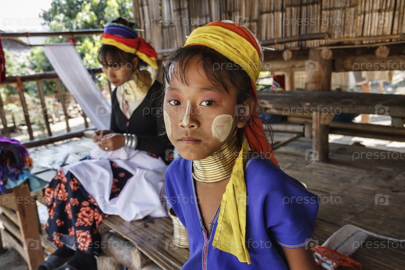 Таиланд, Чианг Май, падаунг - народ группы каренов, девушка и ее мать в традиционном костюме. Женщины надевают латунные кольца на шею в 5-6 лет и увеличивают ежегодно их количество для увеличения длины шеи