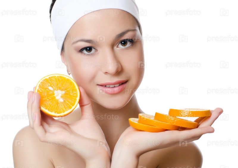 Красивая женщина с апельсином на белом фоне