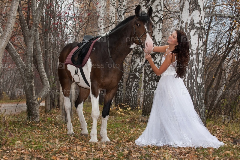 Молодая женщина и лошадь в лесу