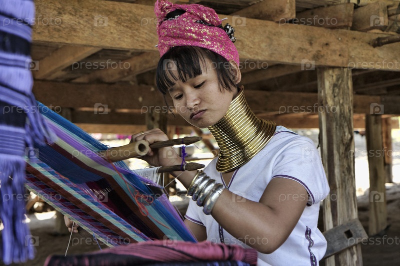 Женщина с длинной шеей в традиционном костюме.Женщины надевают медные кольца на шею в возрасте 5-6 лет и увеличивают их количество ежегодно, пока шея не станет более длинной, что является явным проявлением