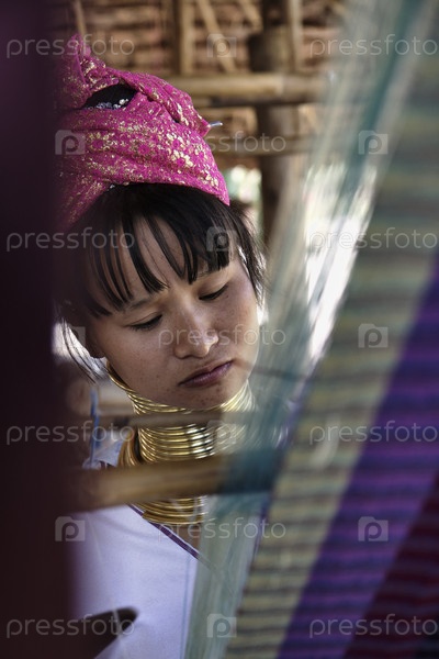 Женщина с длинной шеей в традиционном костюме.Женщины надевают медные кольца на шею в возрасте 5-6 лет и увеличивают их количество ежегодно, пока шея не станет более длинной, что является явным проявлением
