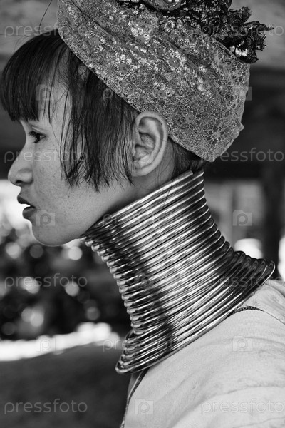 Женщина с длинной шеей в традиционном костюме.Женщины надевают медные кольца на шею в возрасте 5-6 лет и увеличивают их количество ежегодно, пока шея не станет более длинной, что является явным проявлением